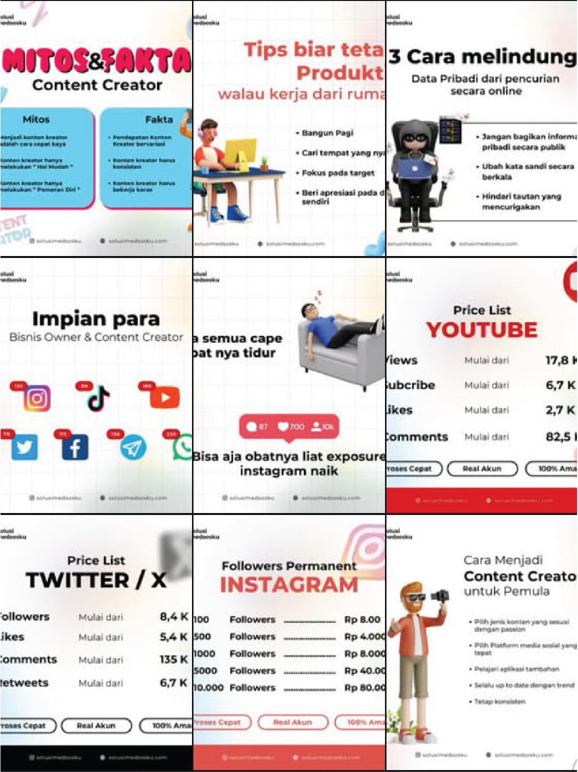 Desain konten, manajemen akun, iklan, strategi, dan program akselerasi audience untuk bikin akun kamu terlihat lebih kredibel, lebih rame, dan lebih dipercaya.